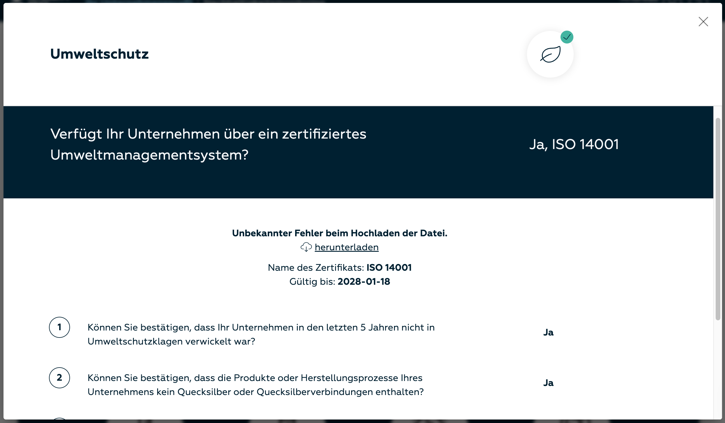Stellen Sie sicher, dass das Dokument das korrekte Format hat und keine schädlichen Inhalte enthält. Führen Sie vor dem erneuten Upload (auf https://app.integritynext.com/questionnaire) einen Malware-Scan mit Ihrer verfügbaren Sicherheitssoftware durch.